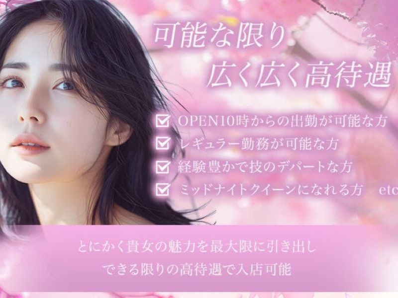 | 待遇 | 1.最大限に広く広く高待遇!! ・OPEN10時からの出勤が可能な方 ・レギュラー勤務が可能な方 ・経験豊かで技のバリエーション豊かな方 ・ミッドナイトクイーンになれる方etc... とにかくあなたの魅力を最大限に引き出し、可能な限りの高待遇で入店可能!! 2.面倒なバスタオルの洗濯釣り銭準備は一切ナシ!! キャッシュレスの時代なのに出勤前にドタバタコンビニで必要ない飲み物を買って両替する必要もありません。 まだかまだかと脱水が長く感じるバスタオルの洗濯業務もありません。 3.終電後は女性ドライバーによる送迎アリ!! 終電後の予約が重なる時間帯の後1万円だけ稼ぎたいも実現可能です!! |